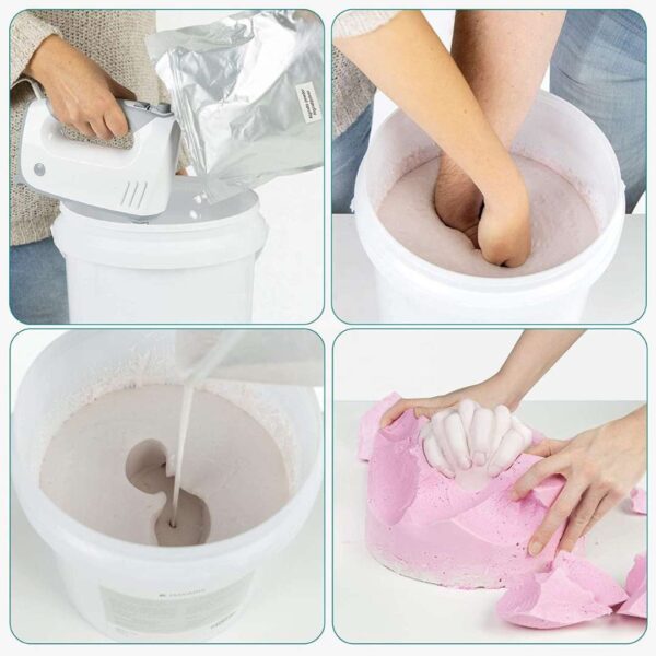 Mold making: The molding material is cold-qualified, non-toxic, and non-allergenic. As long as the hands are immersed in the molding gel, swinging is not a problem. The set-up time is about 6 minutes, including mixing time.